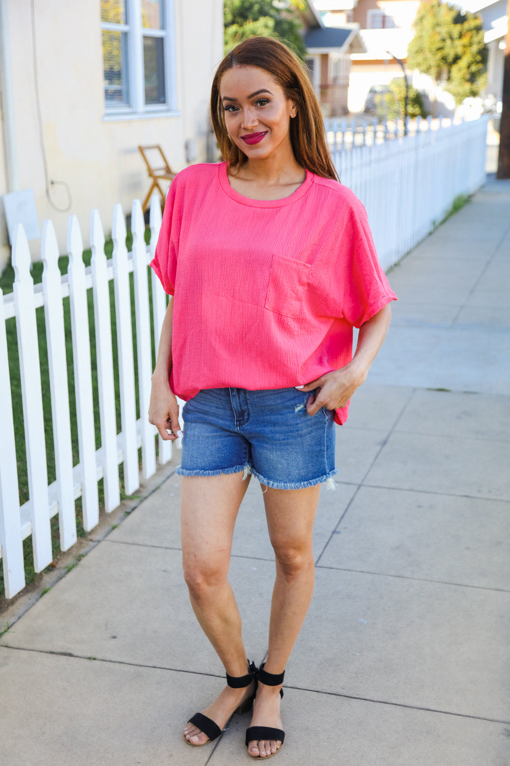 This stunning coral colored crinkle textured top designed with dolman sleeves, a chest pocket and a casual round neck will add charm to any outfit.
