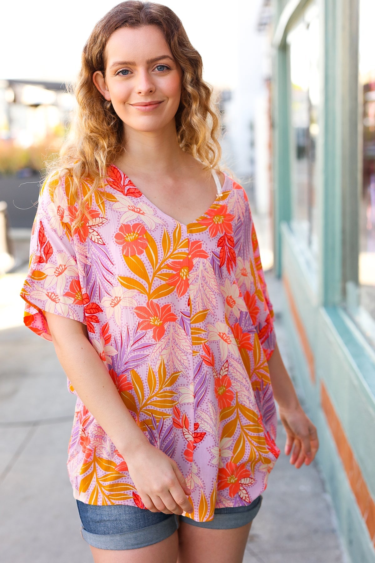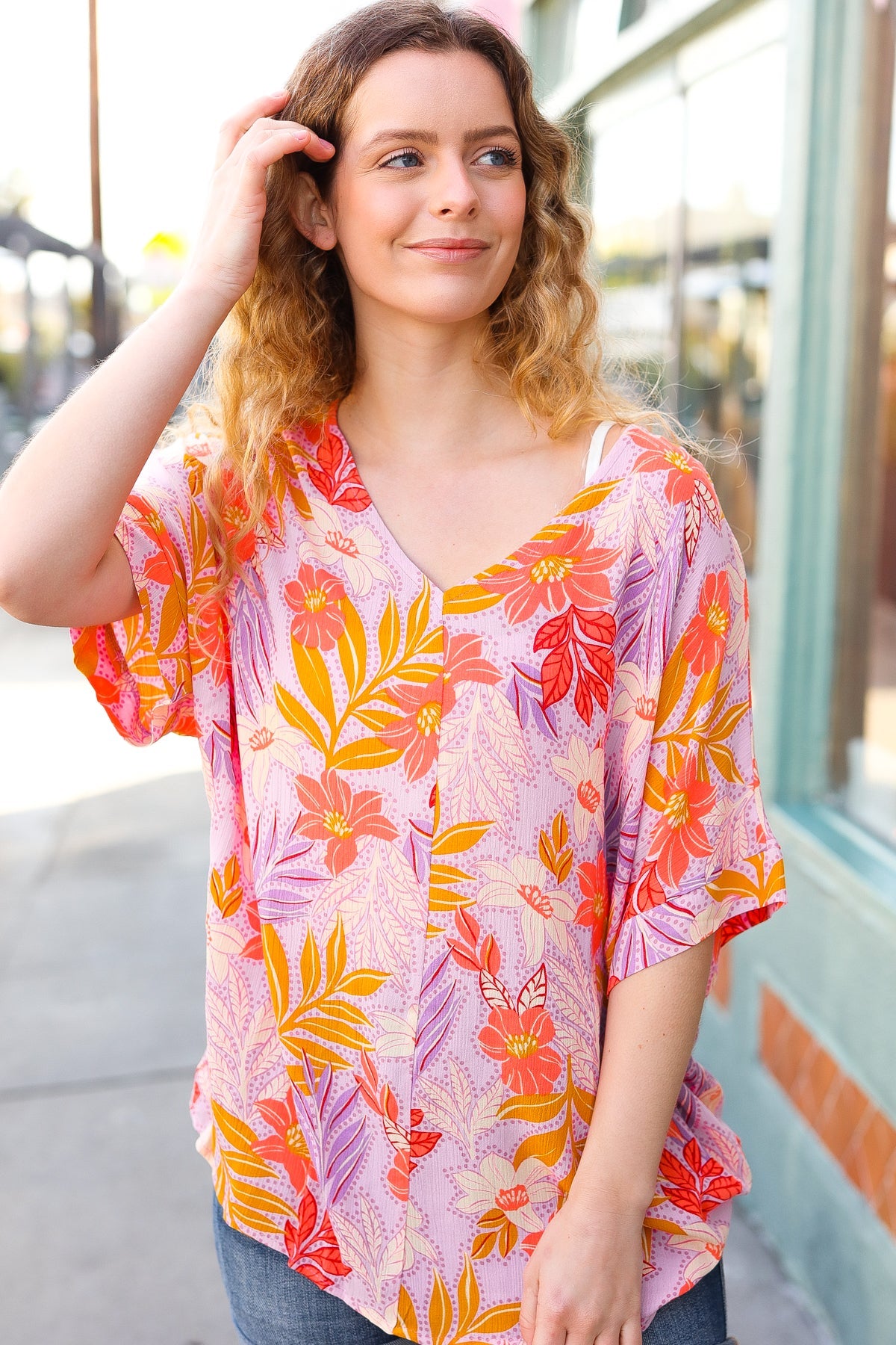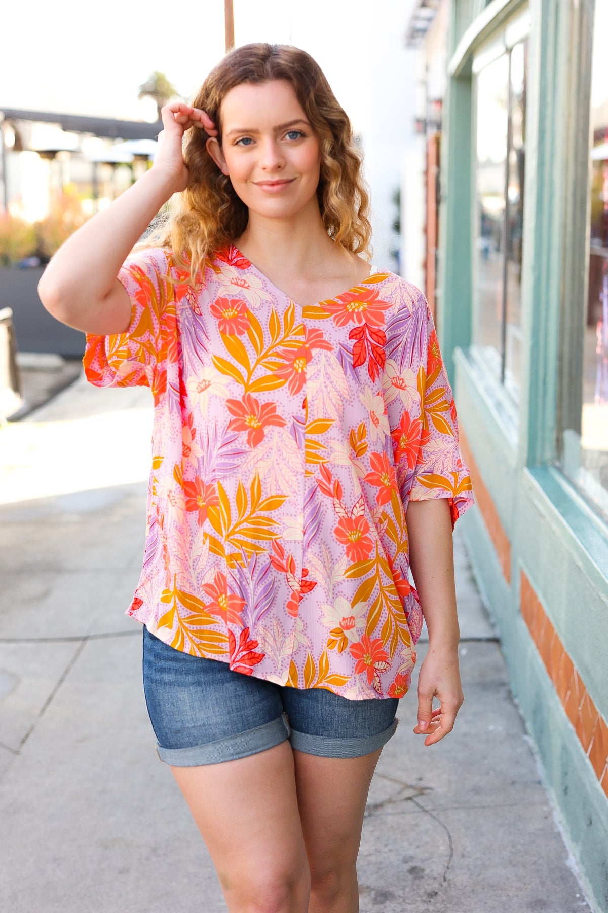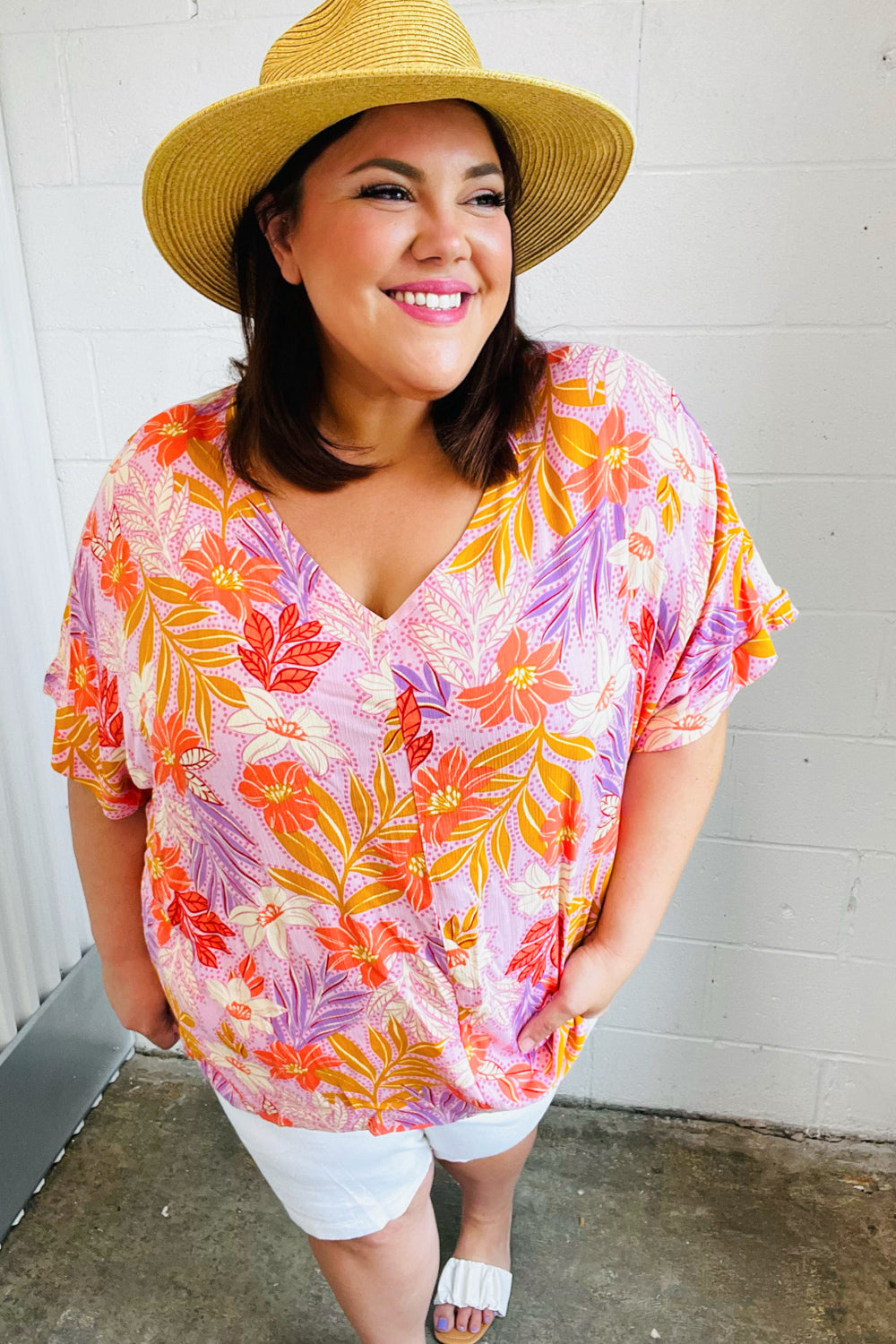 This tropical floral print woven dolman top with banded short sleeves, a wide V neck and a drop shoulder design has a flattering drape and adds charm to any outfit.