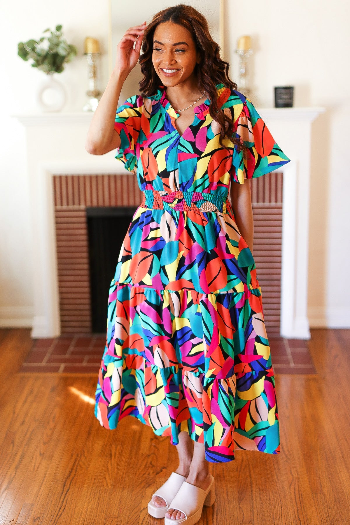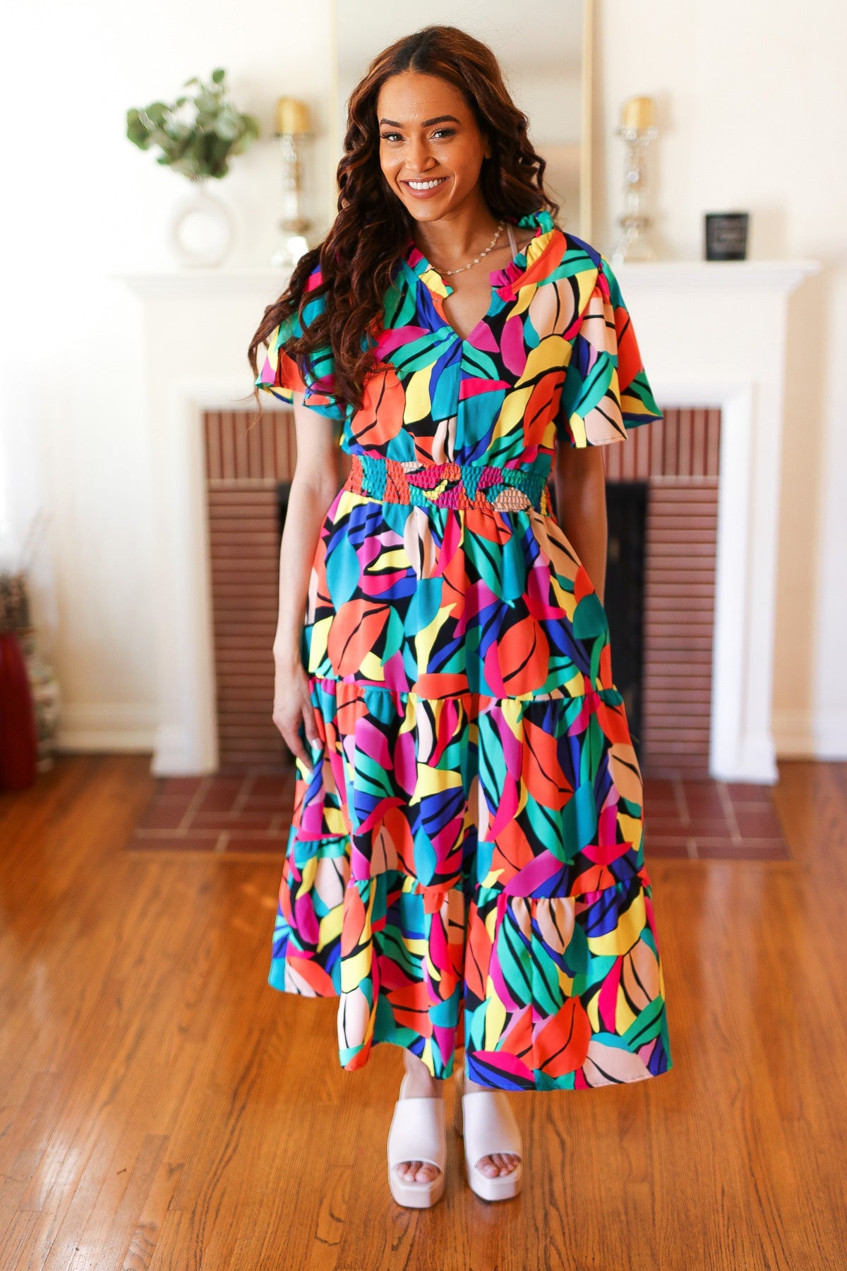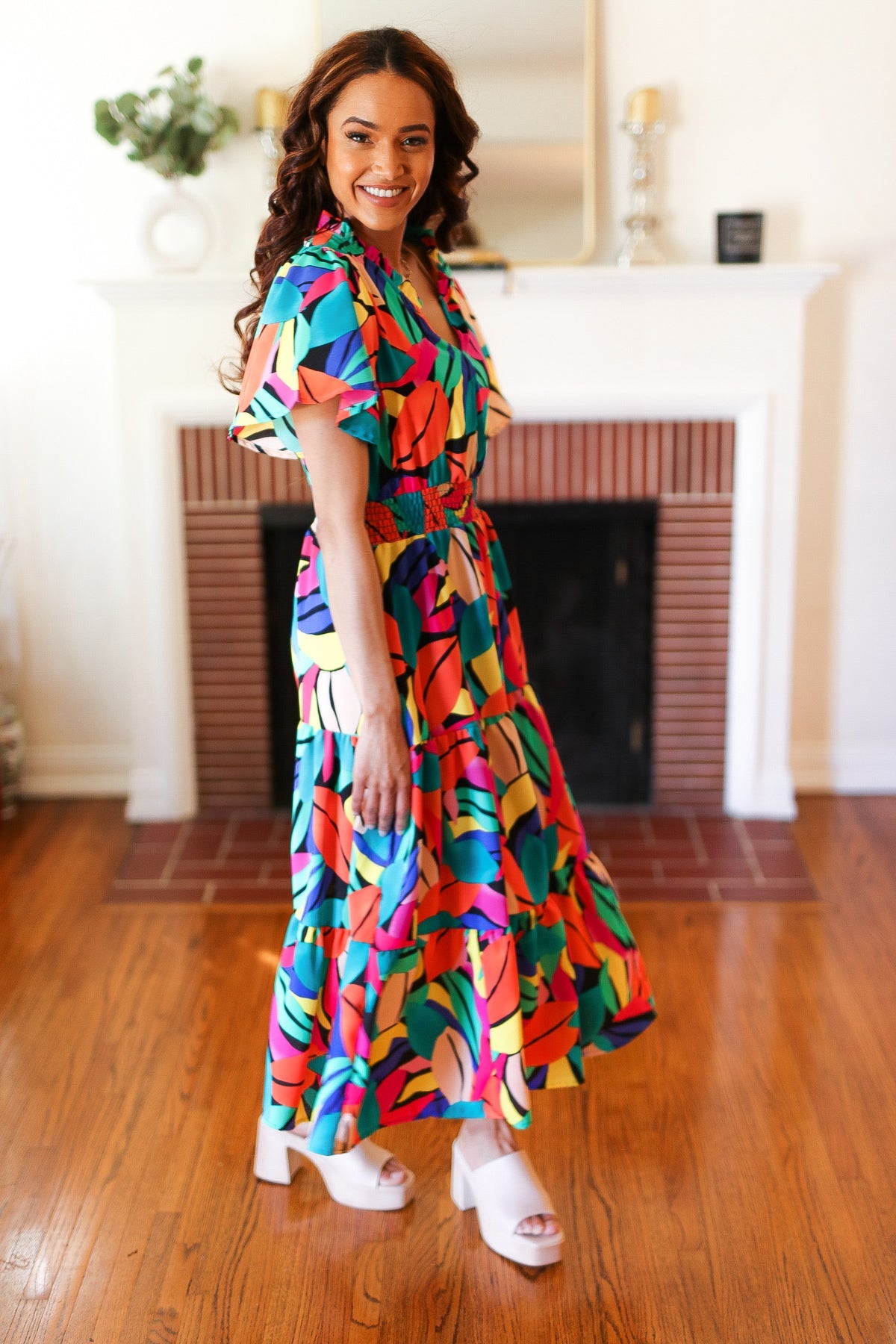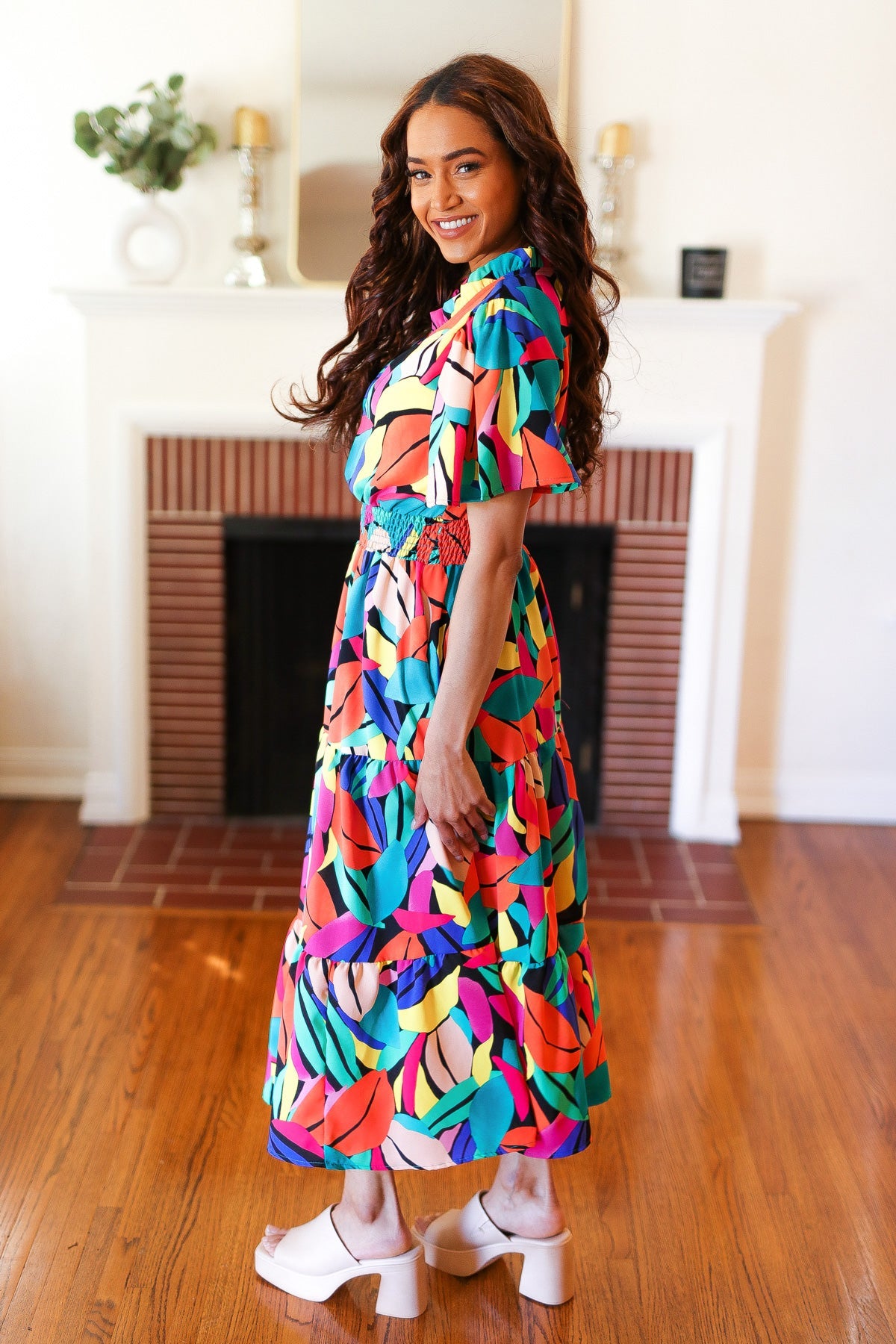 Be Bold Multicolor Abstract Tropical Print Smocked Waist Maxi Dress