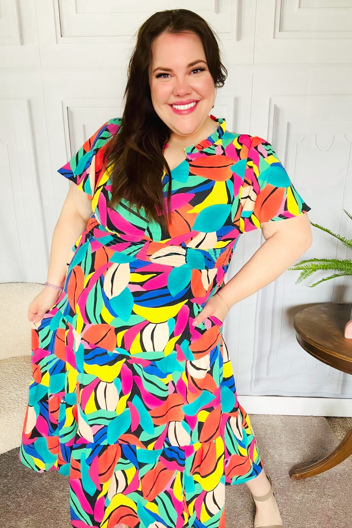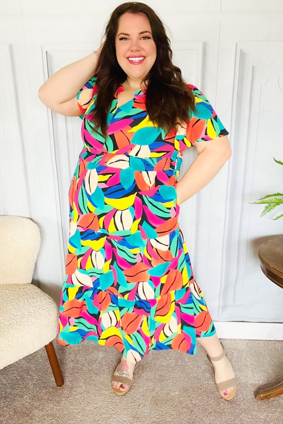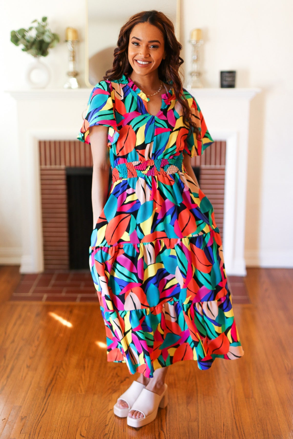 Be Bold Multicolor Abstract Tropical Print Smocked Waist Maxi Dress